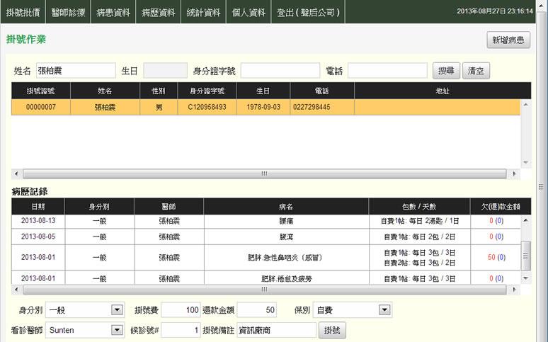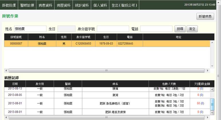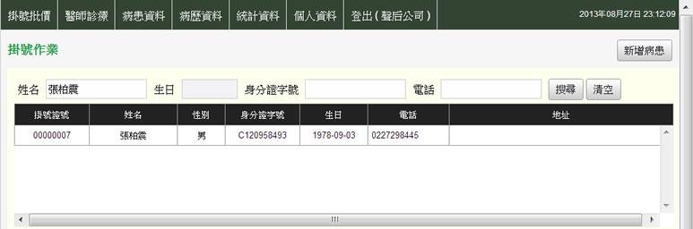 - 選取所要掛號的患者資料,畫面即會帶出該患者的病歷記錄。