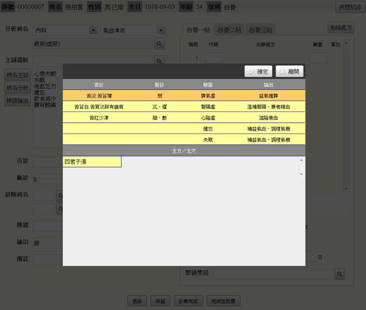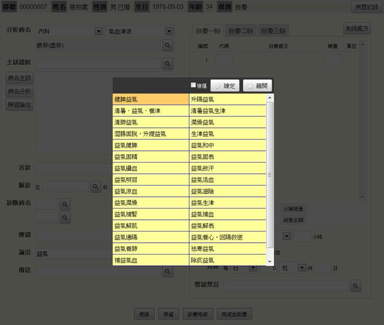 - 系統處方:顯示資料參考「張步桃醫方思維、張步桃藥方妙解、順天堂藥品要覽、針灸配穴、生藥臨床應用、中藥精華、中國方藥學、中藥藥理學、台灣民間藥、簡明藥材學」