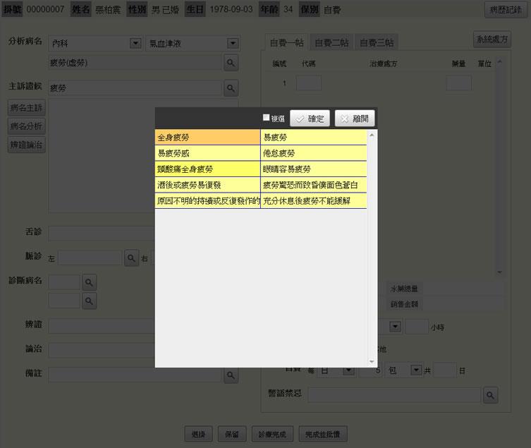 - 主訴:輸入關鍵字或注音碼,點選「查詢鍵」,即出現主訴選單。(或直接輸入主訴)