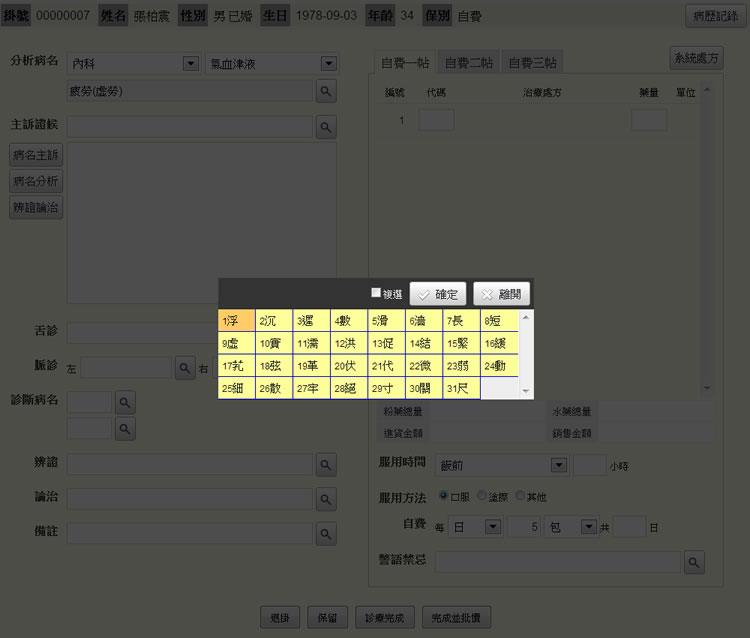 - 脈診:點選「查詢鍵」,出現脈診選單。(或直接輸入脈診)