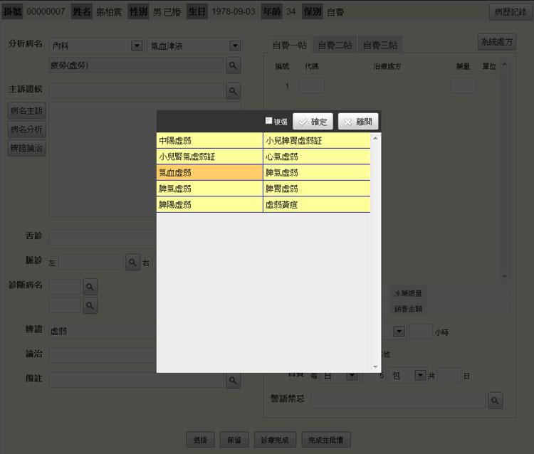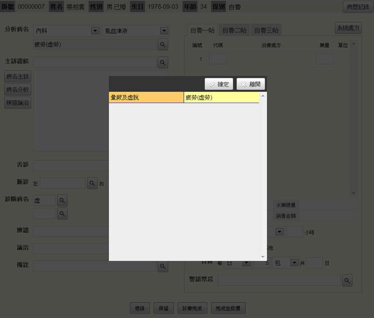 - 病名:輸入關鍵字或注音碼,點選「查詢鍵」,即出現病名選單。
